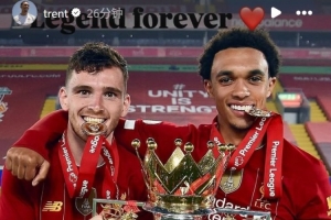 阿诺德晒出了自己效力利物浦时期和罗伯逊一同捧起英超冠军奖杯的合照,并配文:“永远的传奇!”